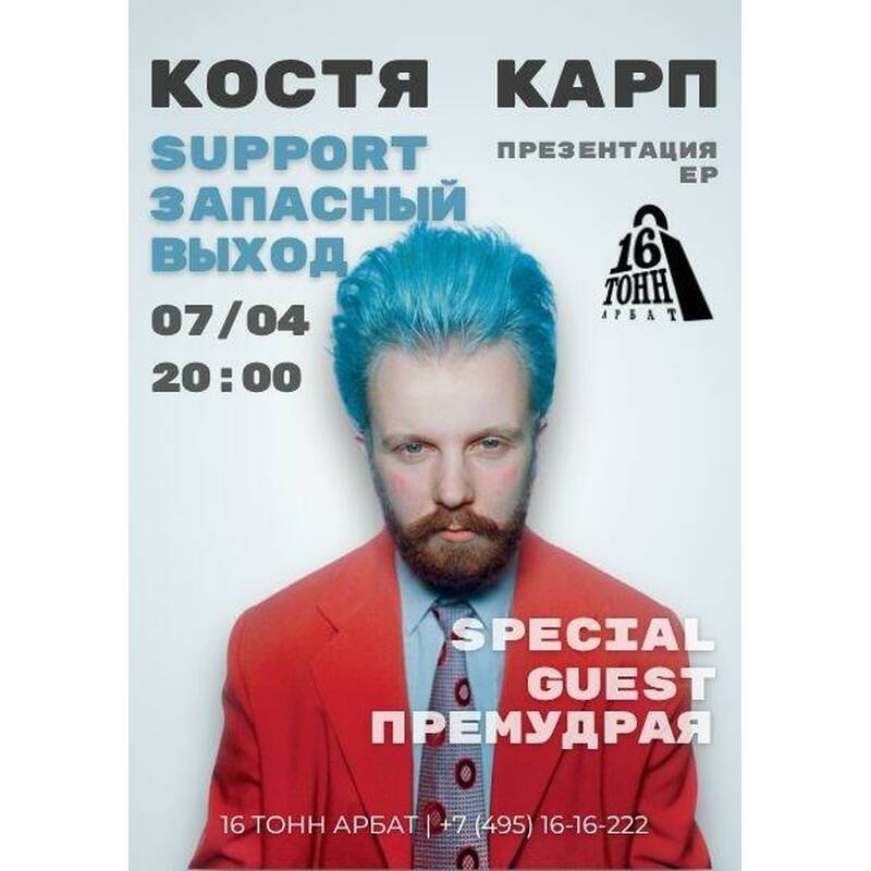 7 апреля концерт Кости Карпа — такое не часто в последнее время и программа соответствующая: несколько невероятных гостей с эстетскими песнями, музыканты-виртуозы, драйв и песни с последних релизов, которые уже были отмечены некоторыми музыкальными обозревателями! Пропускать крайне не рекомендуется-