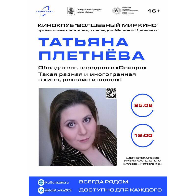 25 июня в Киноклубе «Волшебный мир кино» и Литературный клуб «Книжник’off» Библиотеки № 209 имени А.Н.Толстого ГБУ г. Москвы «Галактика» приглашают на творческую встречу с Татьяной Плетневой, российской актрисой, известной своими ролями в кинофильмах и сериалах.