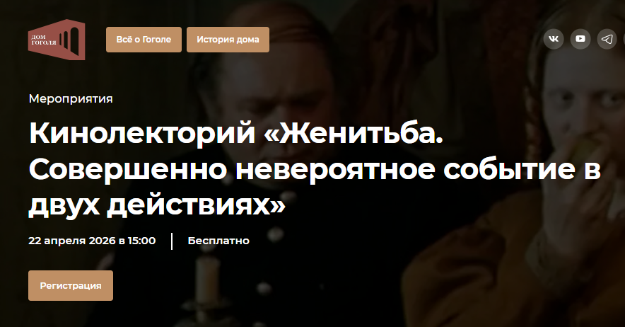 22 апреля 2026 года в 15:00, в рамках проекта «Киносреды в Доме Гоголя», состоится лекция, посвящённая фильму «Женитьба. Совершенно невероятное событие в двух действиях».