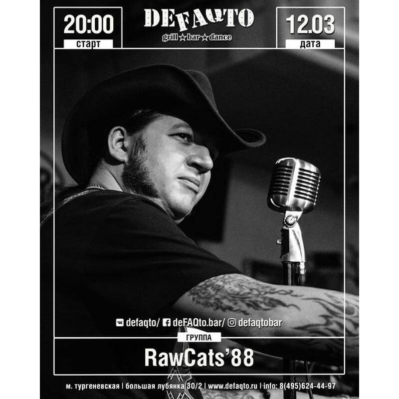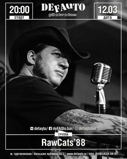 Rawcats’88 — это Рок’н’Ролльная команда, широко известная не только в столице, но и за её пределами. Репертуар коллектива богат нетленными хитами Элвиса Пресли, Джерри Ли Льюиса, Чака Берри, Джонни Кэша и других героев Рок’н’Ролла, а также собственными оригинальными композициями мастерски стилизованными под любимые 50е годы.