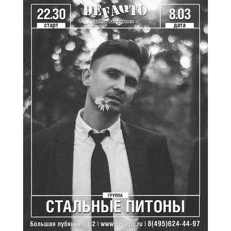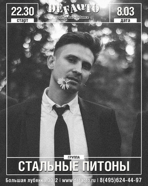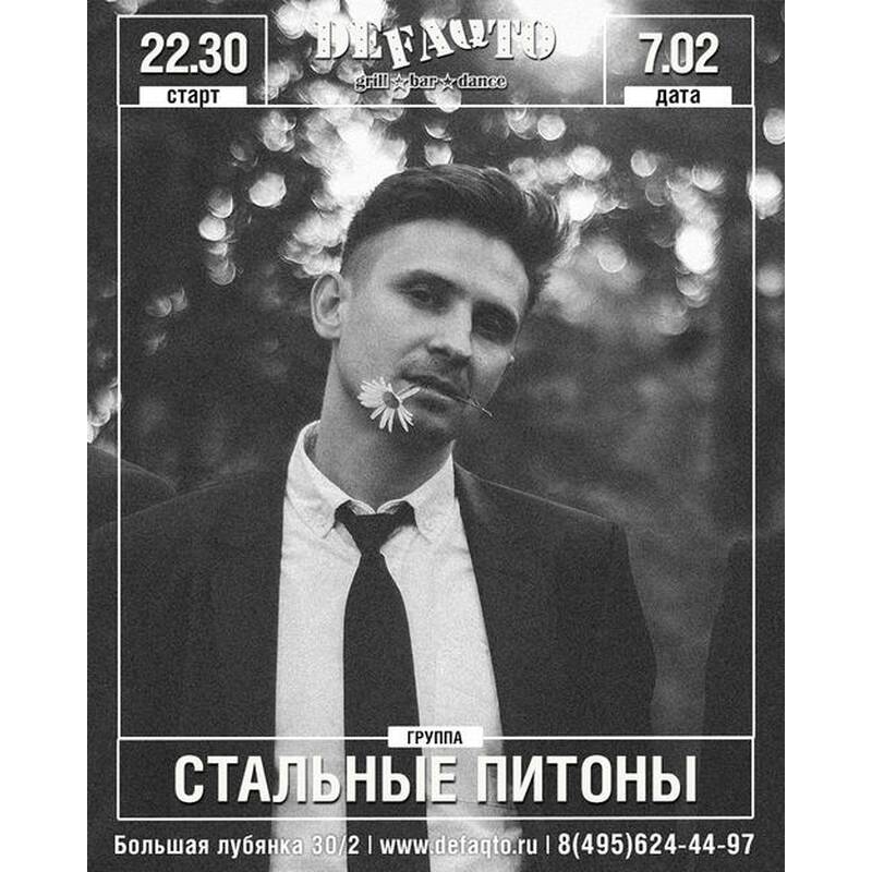 Группа образовалась в январе прошлого года как кружок по интересам. Мы просто приходили на репетиции и играли что хотели (делали кавера на то что нам нравится). Ребята, которые видели и нас слышали со стороны во время репетиций предложили сделать пробное выступление, т.к. то что мы играли их дико вставило! В итоге мы образовали бэнд и назвали его steel pythons в основном, из-за любви нашего басиста к виагре. По сей день существуем, играем и устраиваем дикие тусы!»