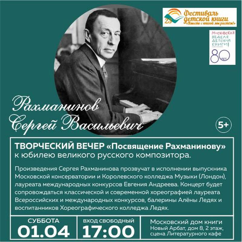 На сцене Московского дома книги прозвучат произведения Сергея Рахманинова в исполнении выпускника Московской консерватории и Королевского колледжа Музыки в Лондоне, лауреата международных конкурсов Евгения Андреева. Также в концерте примут участие воспитанники Хореографического колледжа Ледях и лауреат Всероссийских и международных конкурсов, балерина Алёна Ледях.