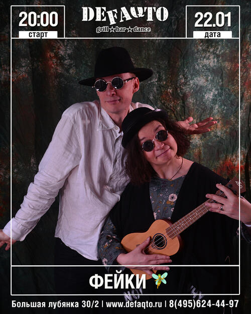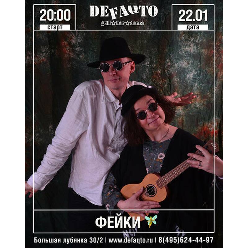 Паранормальный акустический дуэт Фейки приглашает вас провести воскресный вечер в ламповой обстановке бара DeFAQto в сопровождении изысканной музыки своего и чужого сочинения. Прозвучит кое-что из песен Александра Вертинского, произведения в духе шотландского фолка, кантри-рока и других старомодных стилей. Мы будем рады если вы придёте со своими друзьями, любимыми и детьми: наш репертуар 0+, что, однако, не означает его легкомысленности или упрощённости.