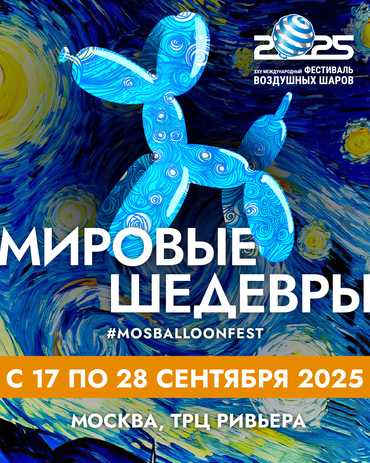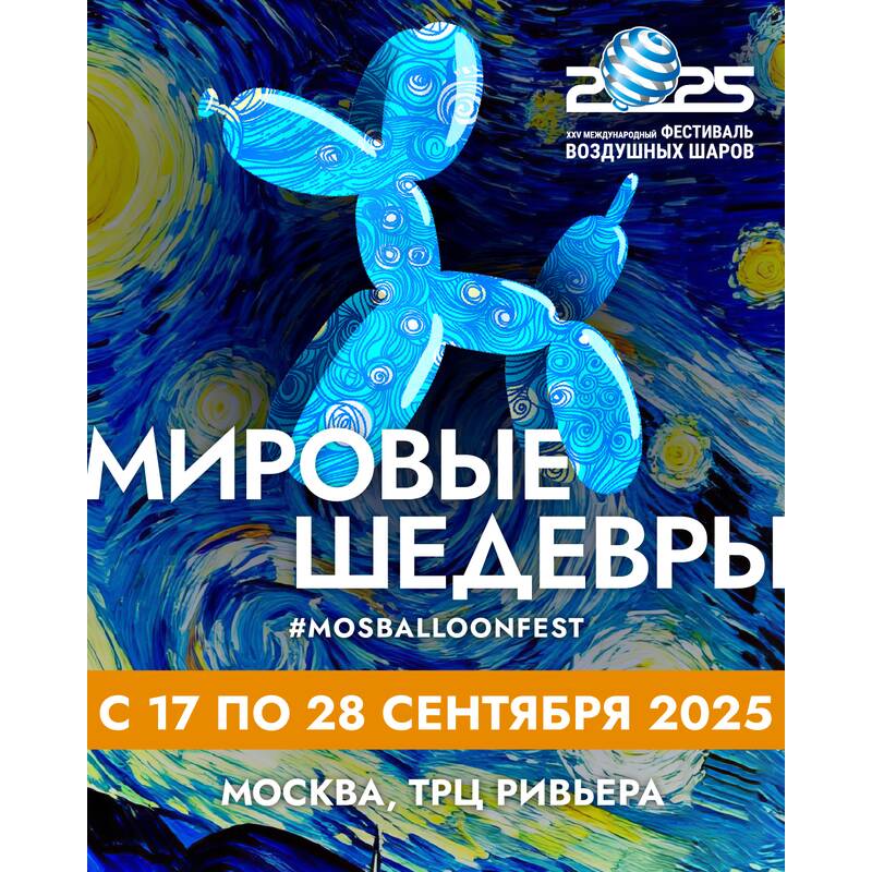 Юбилейный 25-ый Московский Международный Фестиваль воздушных шаров на тему «Мировые шедевры» пройдет с 14 по 20 сентября. В этом году встречаемся на новой площадке: в торгово-развлекательном комплексе «Ривьера». Представьте, если бы Дали и Шагал вместо красок взяли воздушные шары и устроили творческое соревнование. Впрочем, можно не фантазировать, а увидеть это шоу в реальности. Аэрохудожники из России и других стран приедут на Чемпионат по профессиональному аэродизайну, чтобы создать объемные скульптуры и костюмы по мотивам великих произведений. Участники Фестиваля —- чемпионы прошлых лет и молодые мастера, темы своих работ команды держат в секрете. На изготовление большой скульптуры у участников будет всего 25 часов.