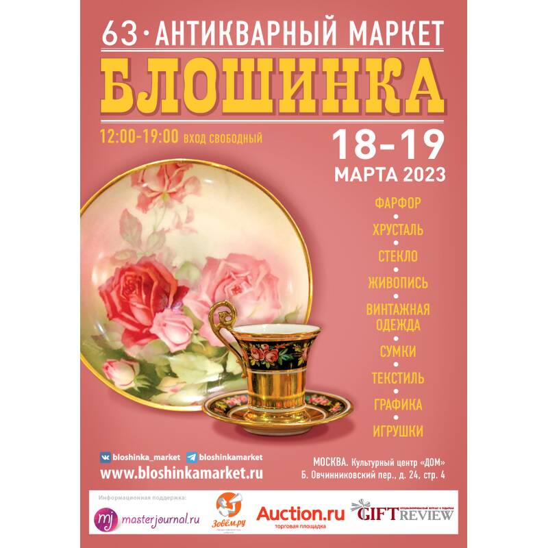 18-19 марта участники «Блошинки» вновь представят гостям маркета обширные коллекции антикварного и винтажного фарфора: как российского, так и европейского; антикварное кружево и вышивка; светильники и предметы интерьера; ювелирные украшения; старинные и винтажные игрушки; коллекционный хрусталь и стекло; медную утварь; серебро и бронзу; живопись и графику; книги и открытки. И это далеко не полный перечень представленных здесь предметов старины. Участники «Блошинки» знают, чем порадовать ценителей прекрасного!