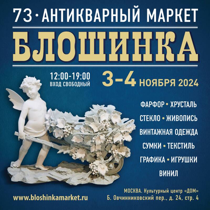 Юбилейный Антикварный маркет «Блошинка» приглашает любителей старины встретить зиму в стиле ретро 3-4 ноября в Культурном центре «ДОМ» в Замоскворечье! Вас ждёт уютная обстановка, демократичные цены и уникальные находки.