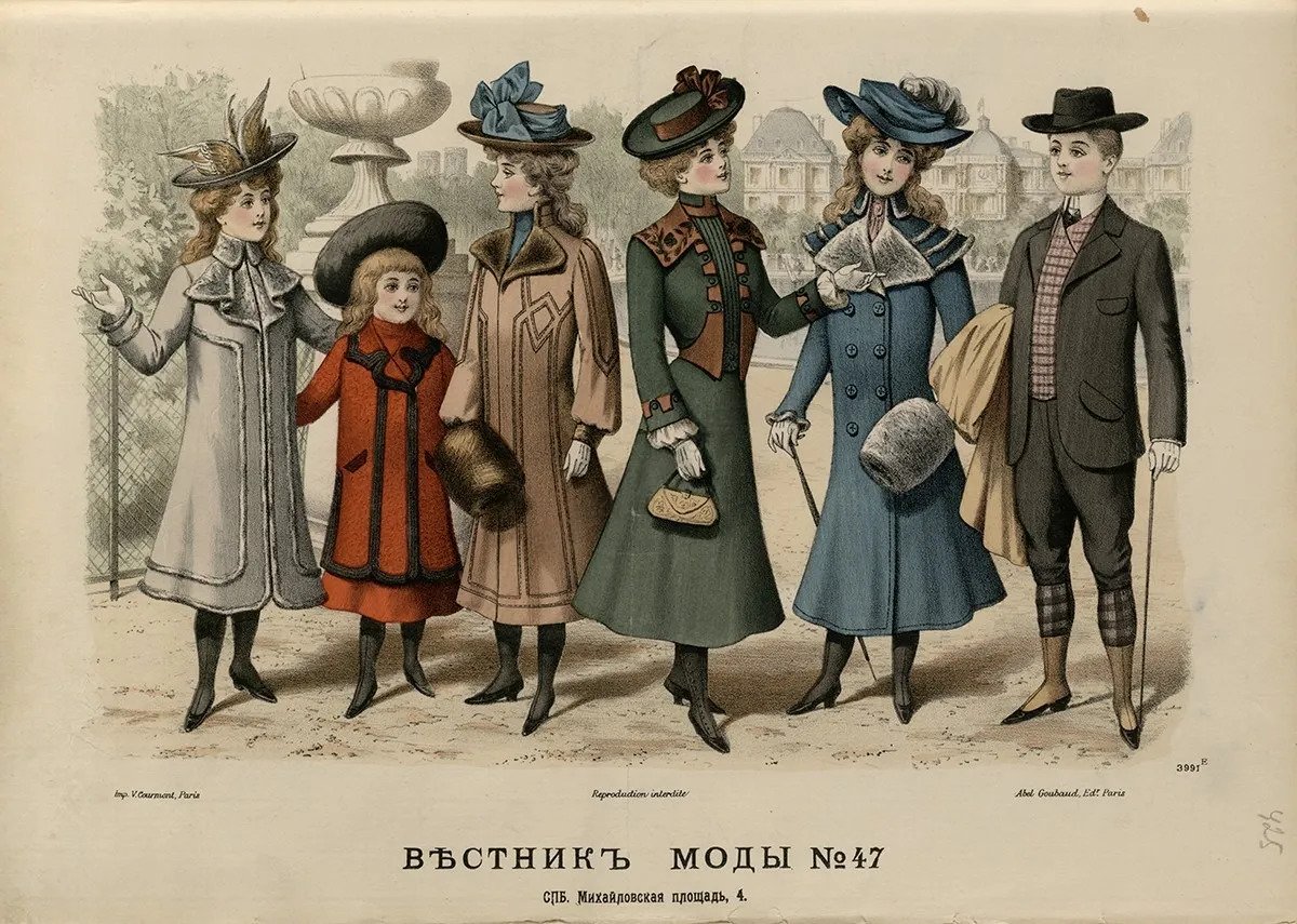 Конец XIX и начало XX веков — это эпоха роскошных платьев для приемов, светского этикета, а также появления крупных магазинов, которые ломились от изобилия тканей, платков и шляпок.