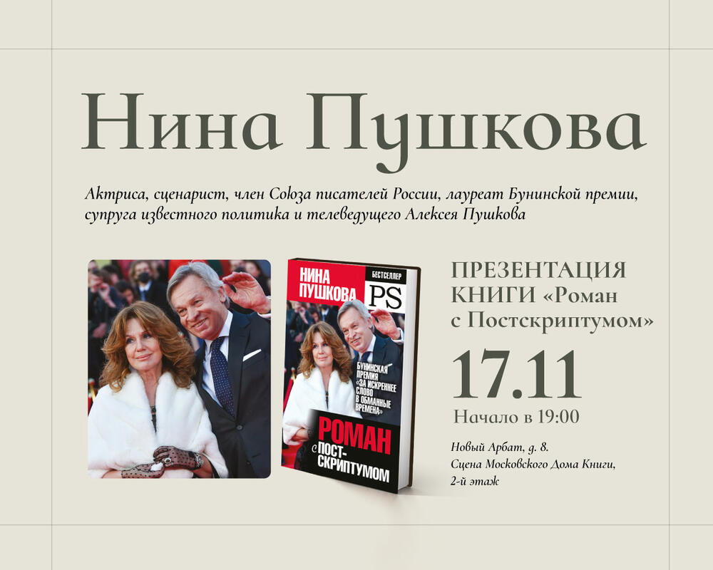 На презентации Нина Пушкова ответит на ваши вопросы, поделится творческими планами, расскажет о своём романе.