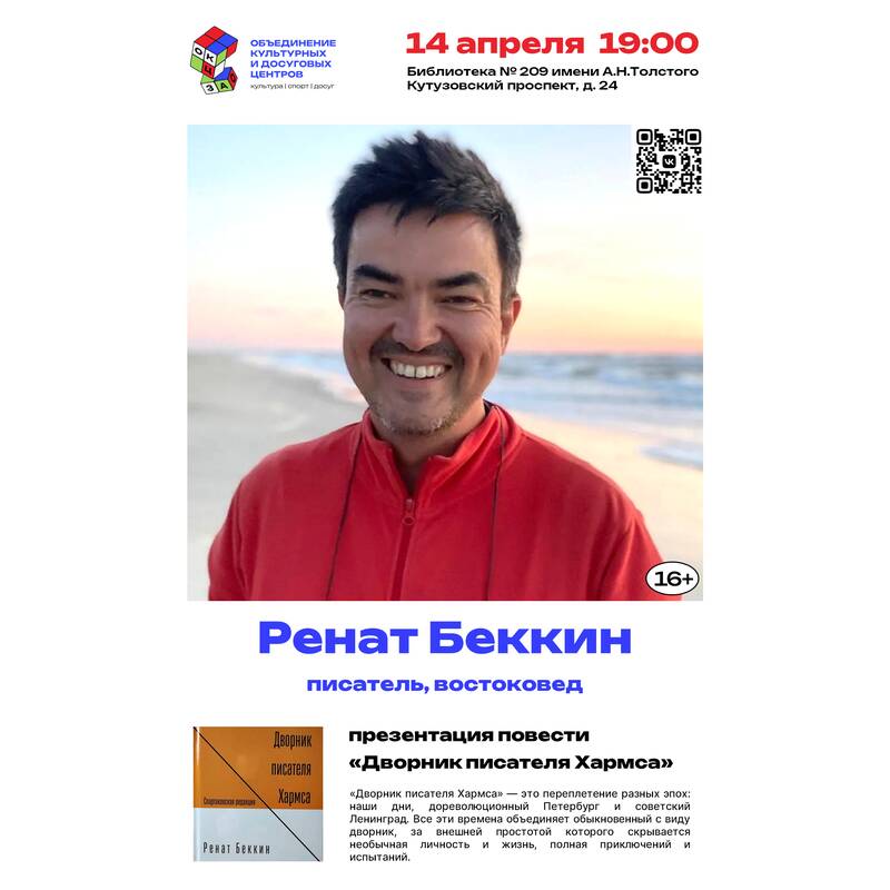 14 апреля в 19:00 состоится творческий вечер писателя и востоковеда Рената Беккина.На встрече состоится презентация повести "Дворник писателя Хармса",которая вышла в издательстве "Спартаковская редакция«.Это станет началом серии,которая объединит произведения, ранее опубликованные,но незаслуженно обойденные читательским вниманием.