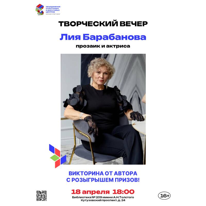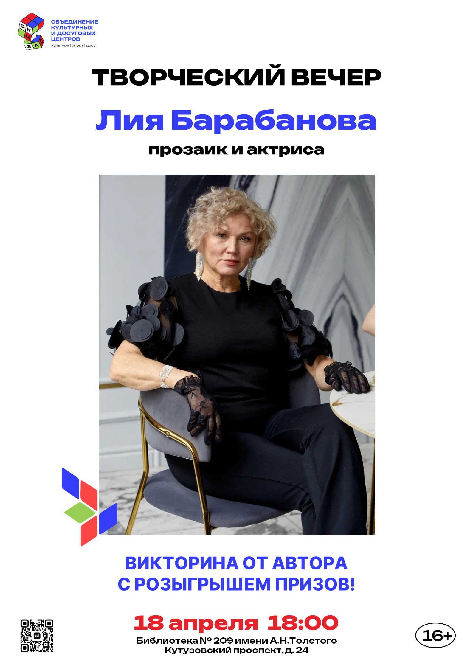 18 апреля в Литературный клуб «Книжник off» Библиотеки № 209 имени А.Н.Толстого приглашает на творческий вечер прозаика и актрисы Лии Барабановой.Публиковалась в журналах и сетевых изданиях: "Русский пионер","Юность","Культурная хроника" и других.