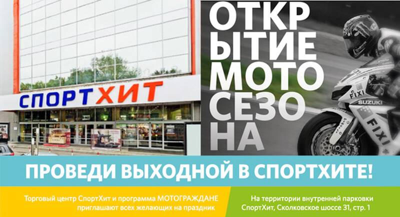 В последние выходные апреля на территории торгового центра спортивных товаров СпортХит пройдет праздничное мероприятие, посвященное открытию мотосезона в столице. Вход для всех желающих — свободный!