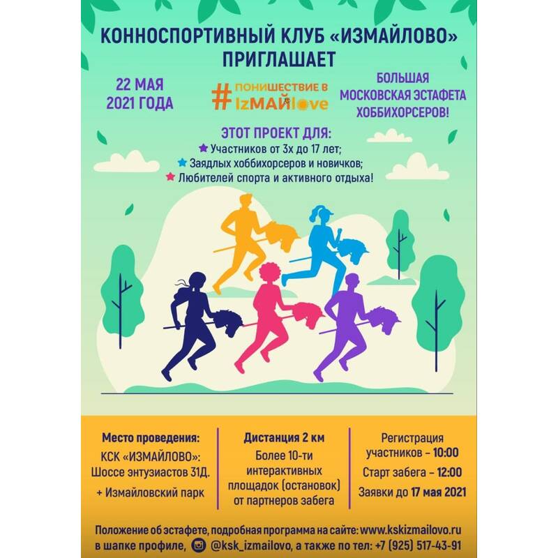 «Большая московская эстафета — 2021» состоятся в рамках спортивной акции «ПОНИшествие в #IzМАЙlove», при содействии Конноспортивного комплекса «Измайлово». В день стартов для жителей и гостей столицы будет организован фестиваль «В гостях у пони» и благотворительная акция «Измайлово-Детям». В программе анимация, конкурсы, мастер-классы, выступление творческих коллективов и многое другое.