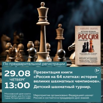 В Московском доме книги на Новом Арбате состоится презентация книги «Россия на 64 клетках: история великих шахматных чемпионов» и детский турнир.