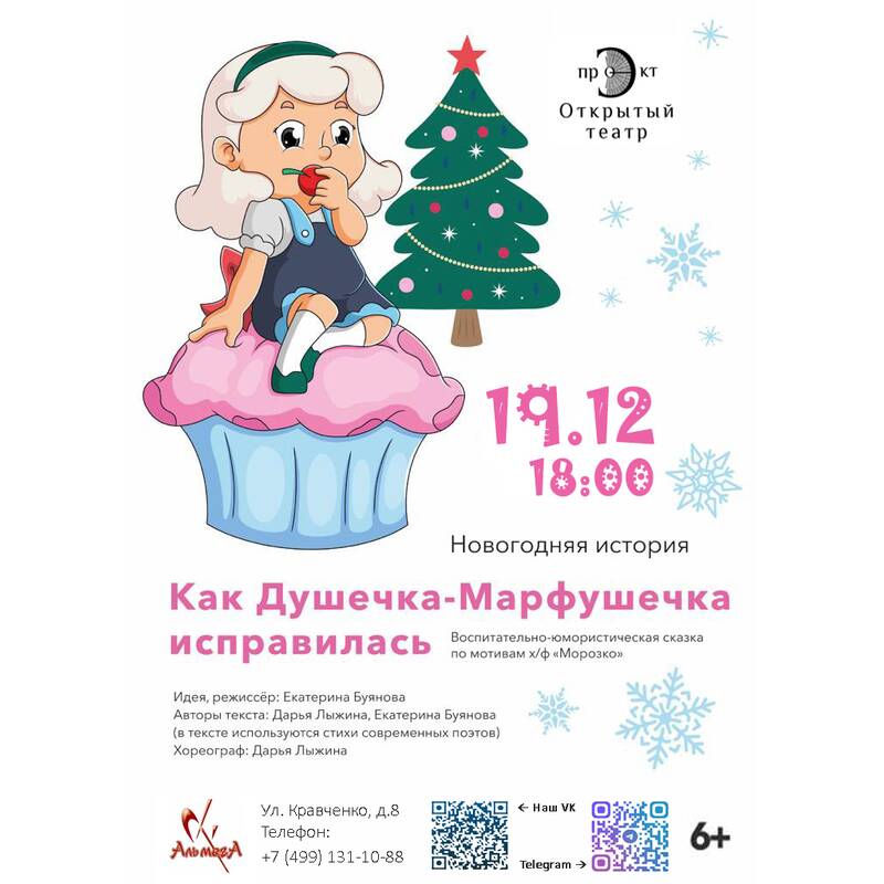 Сказка-фантазия о том, как ленивая и вредная Душечка-Марфушечка становится доброй, жизнерадостной и трудолюбивой. В нашей сказке Марфуша симпатичная и Настенька совсем не «скучноправильная». Жених Настеньки совсем даже не заносчивый Иван, а готовый к любым подвигам Степан. Дед с Бабкой ссорятся по-доброму и очень наивно верят всему вокруг. Леший с Бабой-Ягой хозяйничают в лесу, но Деда-Мороза слушаются и побаиваются. В коротких забавных сценках маленькие зрители узнают о том, как с помощью простого труда и доброты можно самим творить настоящие чудеса. Взрослые улыбнутся современной поэзии и проникнутся мыслью, что нашим любимым детям важно давать возможность проявлять самостоятельность и ответственность.