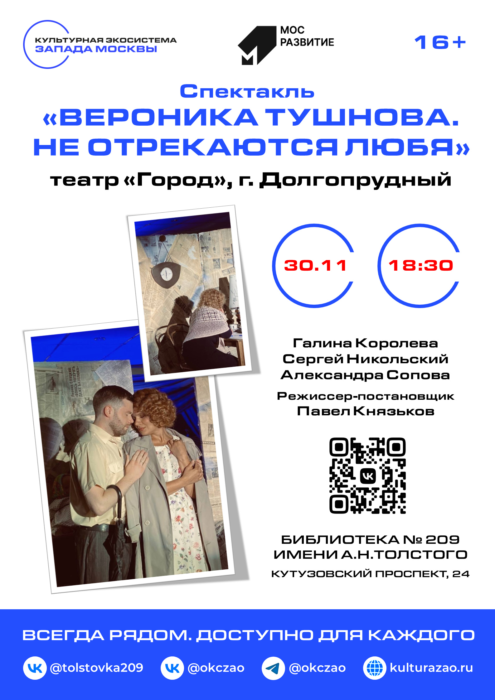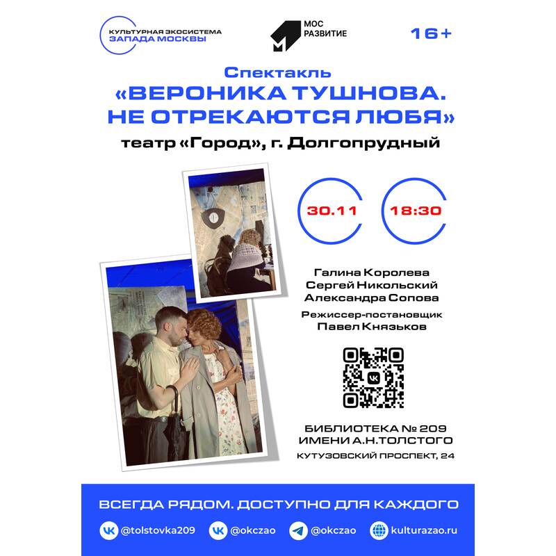30 ноября в Библиотеке № 209 имени А.Н.Толстого в рамках Дня открытых дверей состоится спектакль «Вероника Тушнова. Не отрекаются любя». (театр «Город» г. Долгопрудный). Режиссер-постановщик Павел Князьков.