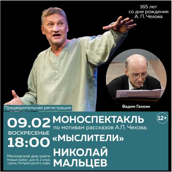 Николай Мальцев — заслуженный артист России, актёр Московского театра иллюзии (Сцена на Перовской) — блестяще сочетает в своём моноспектакле «Мыслители» несколько рассказов А.П. Чехова, многие из которых относятся к раннему периоду творчества писателя: «О бренности», «В цирюльне», «Средство от запоя», «На святках», «Дочь Альбиноса», «Нахлебники», «Мыслитель».